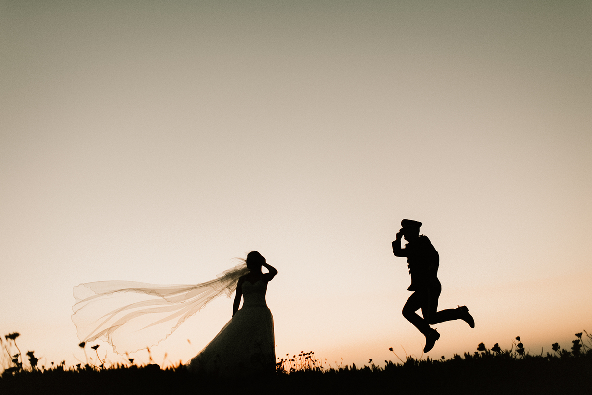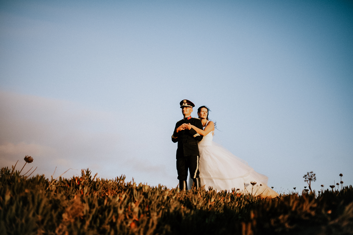 Ali, a farda militar ganhou uma nova leitura. Não apenas símbolo de honra, mas de coragem. A Cristina caminhava ao lado dele com naturalidade, o vestido a mover-se ao ritmo do vento. O contraste entre a estrutura da farda e a fluidez do tecido criou imagens fortes, autênticas e intemporais.