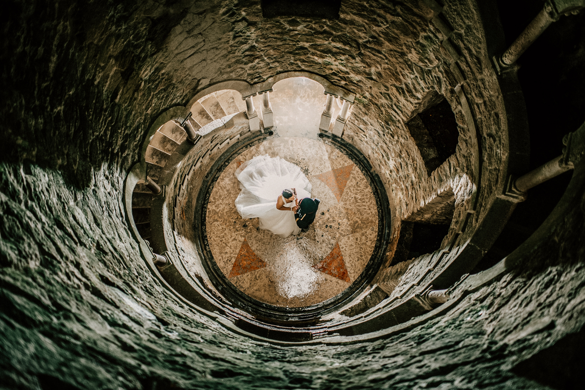 A sessão de noivos na Quinta da Regaleira começou entre escadarias imponentes, arcos manuelinos e jardins geométricos. Descemos até ao icónico Poço Iniciático, onde a luz natural desenhava sombras gráficas nas paredes de pedra.