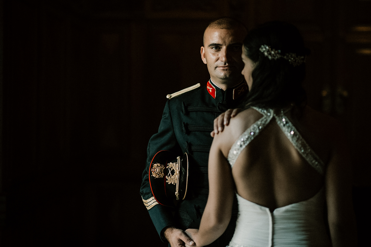 A farda de gala do Veríssimo destacava-se no cenário histórico, enquanto a Cristina equilibrava a composição com leveza e proximidade. Não havia encenação excessiva, apenas gestos subtis, olhares demorados e mãos entrelaçadas.