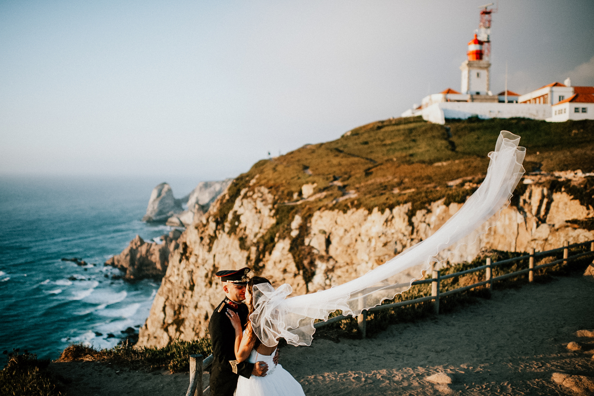 Depois da intensidade arquitetónica, seguimos para o horizonte aberto do Cabo da Roca. A falésia, o vento constante e o som do Atlântico trouxeram uma energia crua e cinematográfica à sessão de noivos.